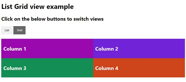 <!DOCTYPE html> <html> <head> <style> * { box-sizing: border-box; } body { font-family: "Segoe UI", Tahoma, Geneva, Verdana, sans-serif; } /* Create two equal columns that floats next to each other */ .column { float: left; width: 50%; padding: 10px; color: white; } /* Clear floats after the columns */ .row:after { content: ""; display: table; clear: both; } /* Style the buttons */ .btn { border: none; outline: none; padding: 12px 16px; background-color: #f1f1f1; cursor: pointer; } .btn:hover { background-color: #ddd; } .btn.active { background-color: #666; color: white; } </style> </head> <body> <h1>List Grid view example</h1> <h2>Click on the below buttons to switch views</h2> <div id="btnContainer"> <button class="btn" onclick="listView()">List</button> <button class="btn active" onclick="gridView()">Grid</button> </div> <br /> <div class="row"> <div class="column" style="background-color:rgb(154, 9, 173);"> <h2>Column 1</h2> </div> <div class="column" style="background-color:rgb(113, 35, 216);"> <h2>Column 2</h2> </div> </div> <div class="row"> <div class="column" style="background-color:rgb(19, 143, 85);"> <h2>Column 3</h2> </div> <div class="column" style="background-color:rgb(207, 69, 27);"> <h2>Column 4</h2> </div> </div> <script> var elements = document.querySelectorAll(".column"); function listView() { Array.from(elements).forEach(item => { item.style.width = "100%"; }); Array.from(document.querySelectorAll(".btn")).forEach((item, index) => { if (index === 0) item.classList.add("active"); else item.classList.remove("active"); }); } function gridView() { Array.from(elements).forEach(item => { item.style.width = "50%"; }); Array.from(document.querySelectorAll(".btn")).forEach((item, index) => { if (index === 1) item.classList.add("active"); else item.classList.remove("active"); }); } </script> </body> </html>