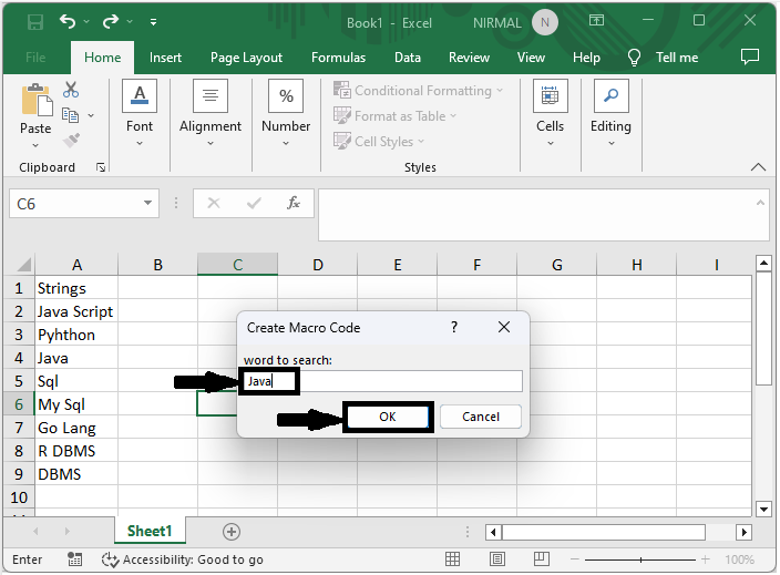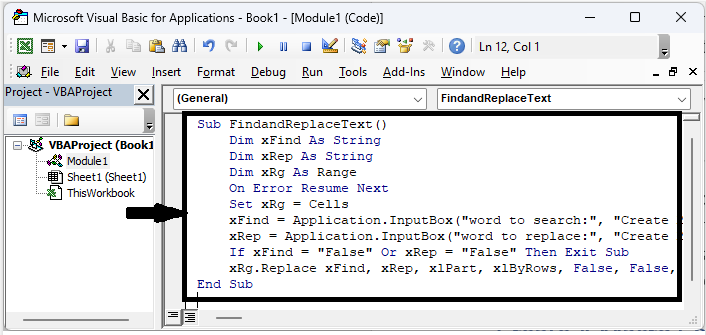 在這裡,我們將首先建立一個 VBA 模組,然後執行它來完成任務。因此,讓我們來看一個簡單的過程,學習如何建立宏程式碼以在 Excel 中查詢和替換文字。
