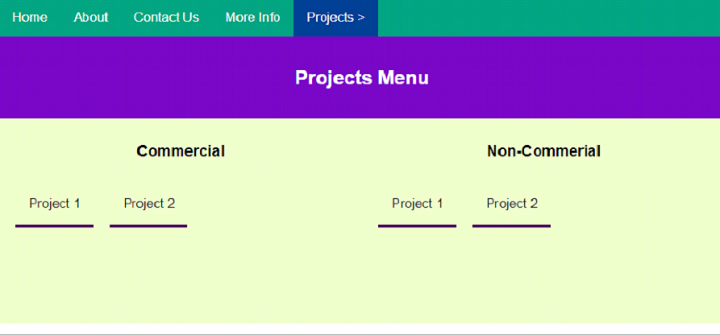 這是我們的全寬下拉選單。我們為行和列設定了不同的div,使其成為一個mega下拉選單: