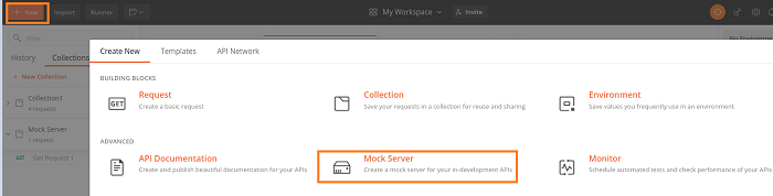 步驟1 - 點選Postman應用程式頂部的“新建”。然後點選“模擬伺服器”連結。