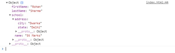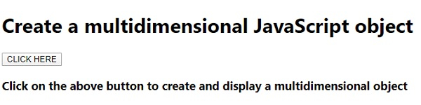 <!DOCTYPE html> <html lang="en"> <head> <meta charset="UTF-8" /> <meta name="viewport" content="width=device-width, initial-scale=1.0" /> <title>Document</title> <style> body { font-family: "Segoe UI", Tahoma, Geneva, Verdana, sans-serif; } .result { font-size: 18px; font-weight: 500; color: rebeccapurple; } </style> </head> <body> <h1>Create a multidimensional JavaScript object</h1> <div class="result"></div> <button class="Btn">CLICK HERE</button> <h3>Click on the above button to create and display a multidimensional object</h3> <script> let resEle = document.querySelector(".result"); let BtnEle = document.querySelector(".Btn"); BtnEle.addEventListener("click", () => { let obj = { firstName: "Rohan", lastName: "Sharma", school: { name: "St Marks", address: { city: "Dwarka", state: "Delhi", }, }, }; console.log(obj); }); </script> </body> </html>