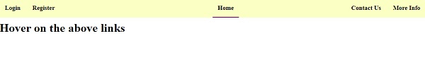 <!DOCTYPE html> <html lang="en"> <head> <meta charset="UTF-8"> <meta name="viewport" content="width=device-width, initial-scale=1.0"> <title>Document</title> <style> body{ margin:0px; margin-top:60px; padding: 0px; } nav{ position: fixed; top:0; width: 100%; background-color: rgb(251, 255, 196); overflow: auto; height: auto; } .left-links{ display: inline-block; position: absolute; left: 0; } .right-links{ display: inline-block; position: absolute; right: 0; } .center-links{ display: inline-block; margin-left: 50%; } .links { display: inline-block; text-align: center; padding: 14px; color: rgb(0, 0, 0); text-decoration: none; font-size: 17px; font-weight: bolder; } .links:hover { border-bottom: 2px solid purple; } .selected{ border-bottom: 2px solid purple; } </style> </head> <body> <nav> <div class="left-links"> <a class="links" href="#"> Login</a> <a class="links" href="#"> Register</a> </div> <div class="center-links"> <a class="links selected" href="#"> Home</a> </div> <div class="right-links"> <a class="links" href="#"> Contact Us</a> <a class="links" href="#">More Info</a> </div> </nav> <h1>Hover on the above links</h1> </body> </html>