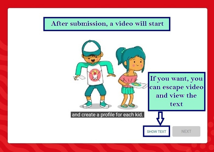 提交後,將開始播放影片指南。您可以觀看它,或者點選“顯示文字”以閱讀影片指令碼。點選“下一步”。