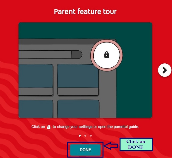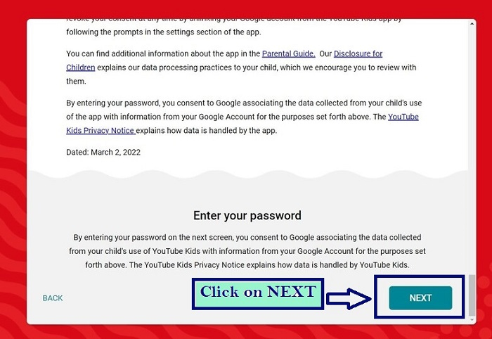 在以下服務條款螢幕上提供您的家長同意。點選“下一步”。