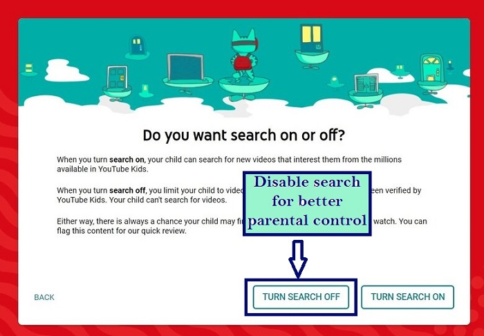 然後,系統會要求您開啟或關閉搜尋功能。開啟時,您的孩子可以訪問 YouTube 兒童版上數百萬個適合兒童的影片。關閉時,
