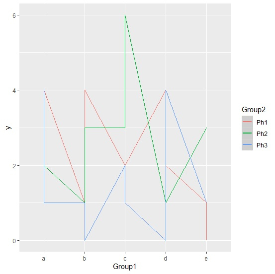 > qplot(Group1, y, data=df, group=Group2, color=Group2, geom='line')+ + geom_smooth(aes(group=interaction(Group1, Group2))) `geom_smooth()` using method = 'loess' and formula 'y ~ x'