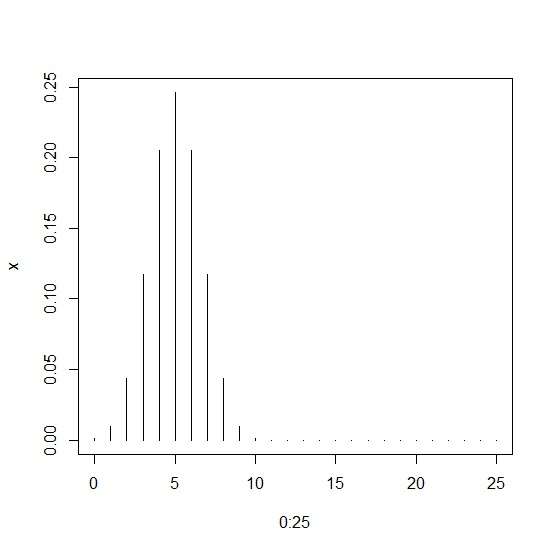 x<-dbinom(0:25,size=10,prob=0.5) plot(0:25,x,type="h")