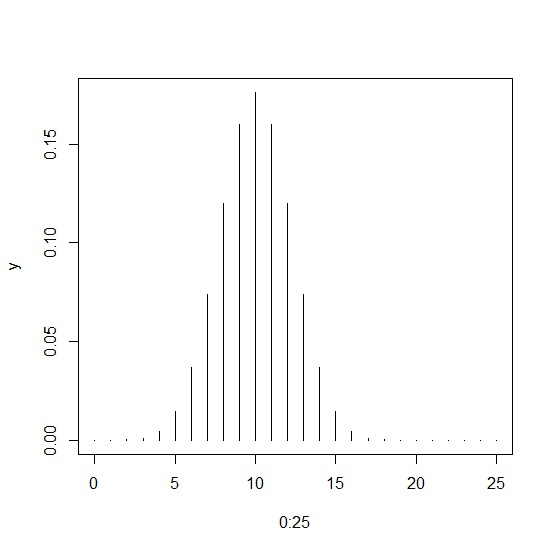 y<-dbinom(0:25,size=20,prob=0.5) plot(0:25,y,type="h")