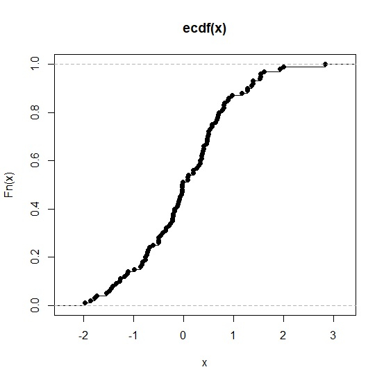 x<-rnorm(100) plot(ecdf(x))