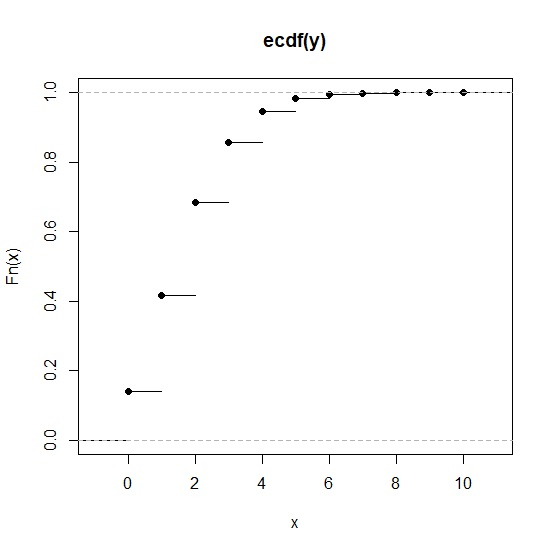 y<-rpois(10000,2) plot(ecdf(y))