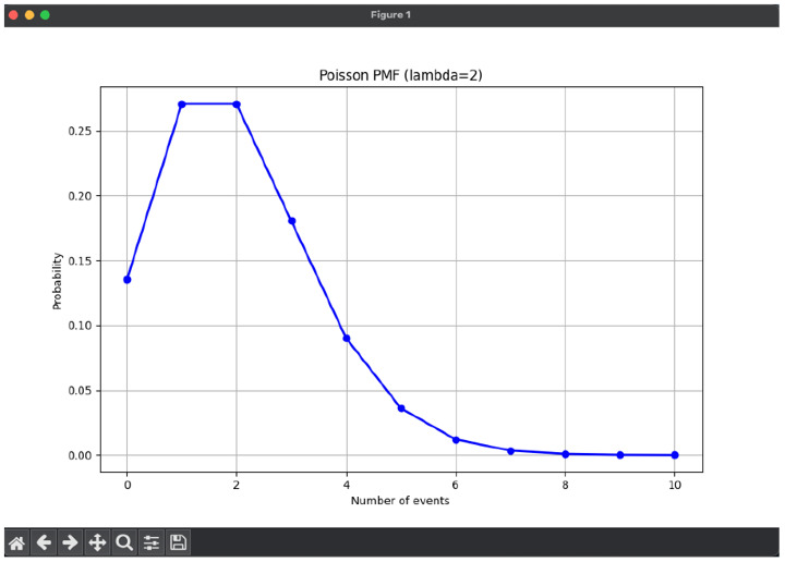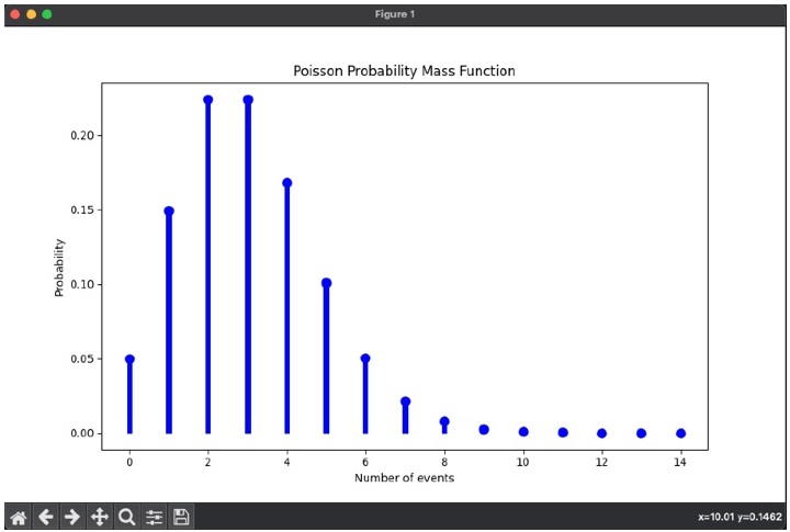 視覺化泊松分佈的一種方法是繪製其機率質量函式 (PMF),它顯示了給定區間內可能發生的每個事件數的機率。在 Python 中,我們可以使用 SciPy 庫生成泊松分佈的 PMF,然後使用 Matplotlib 繪製它。