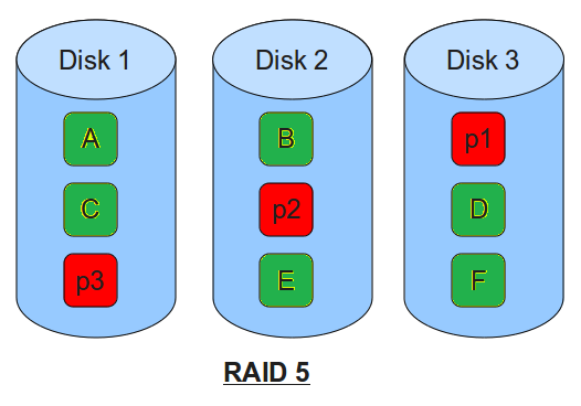 - 在RAID 5中,奇偶校驗資訊是分散式的,一個磁碟容量將用於奇偶校驗。