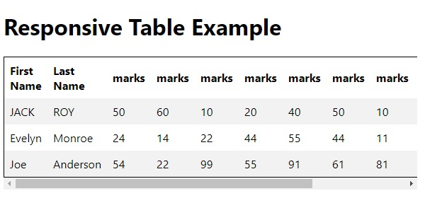 <!DOCTYPE html> <html> <head> <meta name="viewport" content="width=device-width, initial-scale=1"> <style> body{ font-family: 'Segoe UI', Tahoma, Geneva, Verdana, sans-serif; } div{ overflow-x: auto; } table { border-collapse: collapse; border-spacing: 0; width: 100%; border: 1px solid rgb(0, 0, 0); } th, td { text-align: left; padding: 8px; } tr:nth-child(even){background-color: #f2f2f2} </style> </head> <body> <h1>Responsive Table Example</h1> <div> <table> <tr> <th>First Name</th> <th>Last Name</th> <th>marks</th> <th>marks</th> <th>marks</th> <th>marks</th> <th>marks</th> <th>marks</th> <th>marks</th> <th>marks</th> <th>marks</th> <th>marks</th> </tr> <tr> <td>JACK</td> <td>ROY</td> <td>50</td> <td>60</td> <td>10</td> <td>20</td> <td>40</td> <td>50</td> <td>10</td> <td>20</td> <td>30</td> <td>40</td> </tr> <tr> <td>Evelyn</td> <td>Monroe</td> <td>24</td> <td>14</td> <td>22</td> <td>44</td> <td>55</td> <td>44</td> <td>11</td> <td>55</td> <td>22</td> <td>33</td> </tr> <tr> <td>Joe</td> <td>Anderson</td> <td>54</td> <td>22</td> <td>99</td> <td>55</td> <td>91</td> <td>61</td> <td>81</td> <td>11</td> <td>22</td> <td>55</td> </tr> </table> </div> </body> </html>