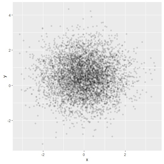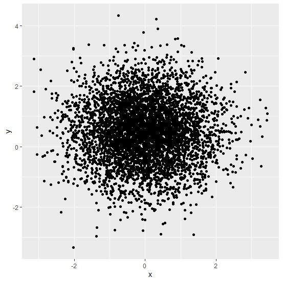 > set.seed(123) > x<-rnorm(5000) > y<-rnorm(5000,0.5) > df<-data.frame(x,y) > library(ggplot2) > ggplot(df,aes(x,y))+geom_point()