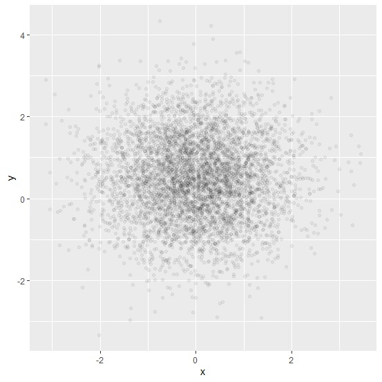 > ggplot(df,aes(x,y))+geom_point(alpha=0.05)