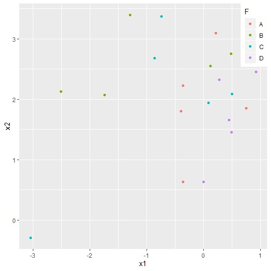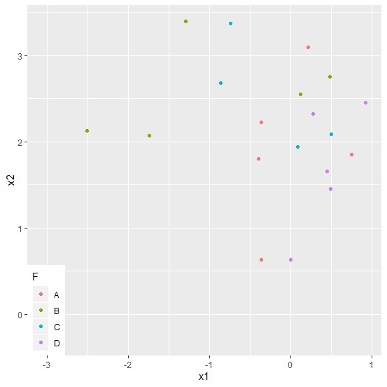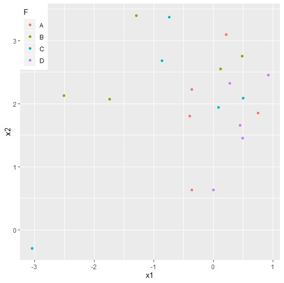> ggplot(df, aes(x=x1, y=x2, colour=F)) + geom_point(aes(colour=F)) + + theme(legend.justification = c(0, 1), legend.position = c(0, 1))