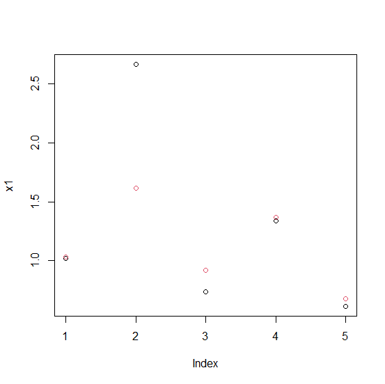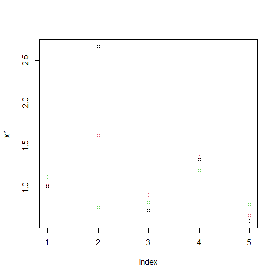 x1<-rnorm(5,1,0.5) x2<-rnorm(5,1,0.4) x3<-rnorm(5,1,0.3) x4<-rnorm(5,1,0.2) x5<-rnorm(5,1,0.1) plot(x1)