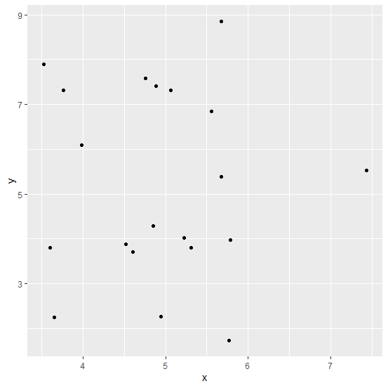 set.seed(151) x<-rnorm(20,5,1) y<-rnorm(20,5,2) df<-data.frame(x,y) df
