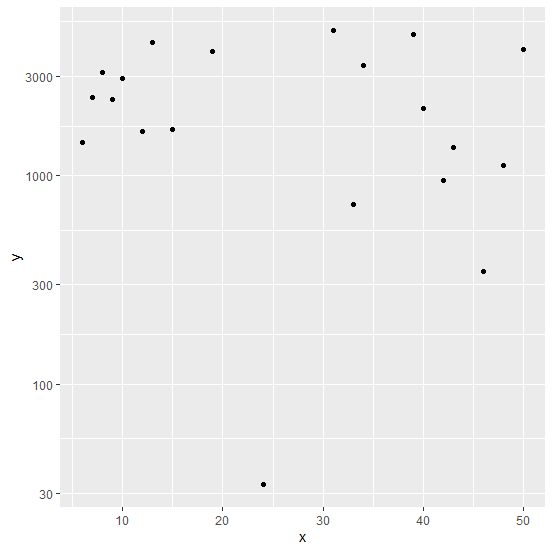 ggplot(df,aes(x,y))+geom_point()+scale_y_continuous(trans='log10')