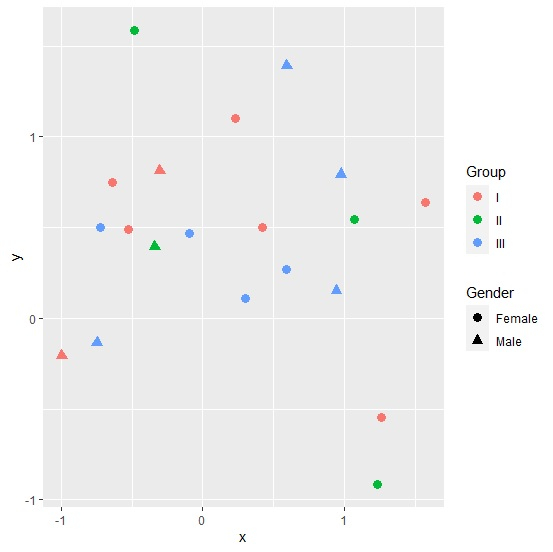 ggplot(df,aes(x,y))+geom_point(aes(shape=Gender,color=Group),size=3)輸出