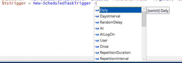 $tsaction = New-ScheduledTaskAction -Execute 'PowerShell.exe' -Argument 'C:\Temp\TestTask.ps1'$User= "NT AUTHORITY\SYSTEM"$tstrigger = New-ScheduledTaskTrigger -At 4:00PM -Once