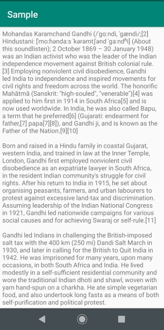 package app.com.sample; import android.support.v7.app.AppCompatActivity; import android.os.Bundle; import android.text.method.ScrollingMovementMethod; import android.widget.TextView; public class MainActivity extends AppCompatActivity { @Override protected void onCreate(Bundle savedInstanceState) { super.onCreate(savedInstanceState); setContentView(R.layout.activity_main); TextView textView = (TextView) findViewById(R.id.textView); String para = "Mohandas Karamchand Gandhi (/ˈɡɑːndi, ˈɡændi/;[2] Hindustani: [ˈmoːɦəndaːs ˈkərəmtʃənd ˈɡaːndʱi] (About this soundlisten); 2 October 1869 – 30 January 1948) was an Indian activist who was the leader of the Indian independence movement against British colonial rule.[3] Employing nonviolent civil disobedience, Gandhi led India to independence and inspired movements for civil rights and freedom across the world. The honorific Mahātmā (Sanskrit: \"high-souled\", \"venerable\")[4] was applied to him first in 1914 in South Africa[5] and is now used worldwide. In India, he was also called Bapu, a term that he preferred[6] (Gujarati: endearment for father,[7] papa[7][8]), and Gandhi ji, and is known as the Father of the Nation.[9][10]