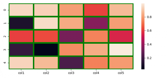 import seaborn as sns import pandas as pd import numpy as np import matplotlib.pyplot as plt plt.rcParams["figure.figsize"] = [7.50, 3.50] plt.rcParams["figure.autolayout"] = True df = pd.DataFrame(np.random.random((5, 5)), columns=["col1", "col2", "col3", "col4", "col5"]) sns.heatmap(df, linewidths=4, linecolor='green') plt.show()