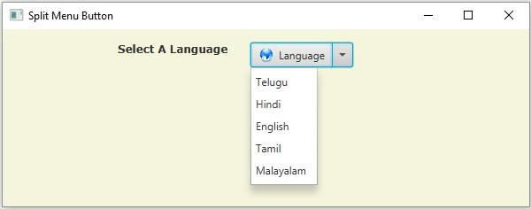 import javafx.application.Application; import javafx.geometry.Insets; import javafx.scene.Scene; import javafx.scene.control.Label; import javafx.scene.control.MenuItem; import javafx.scene.control.SplitMenuButton; import javafx.scene.image.ImageView; import javafx.scene.layout.HBox; import javafx.scene.text.Font; import javafx.scene.text.FontPosture; import javafx.scene.text.FontWeight; import javafx.stage.Stage; public class SplitMenuButtonExample extends Application { public void start(Stage stage) { //Creating an ImageView ImageView img = new ImageView("UIControls/globe.png"); img.setFitWidth(20); img.setFitHeight(20); //Creating a label Label label = new Label("Select A Language"); Font font = Font.font("verdana", FontWeight.BOLD, FontPosture.REGULAR, 12); label.setFont(font); //Creating a menu SplitMenuButton menu = new SplitMenuButton(); //Setting text to the SplitMenuButton menu.setText("Language"); //Setting an image to the button menu.setGraphic(img); //Creating menu Items menu.setMnemonicParsing(true); MenuItem item1 = new MenuItem("Telugu"); MenuItem item2 = new MenuItem("Hindi"); MenuItem item3 = new MenuItem("English"); MenuItem item4 = new MenuItem("Tamil"); MenuItem item5 = new MenuItem("Malayalam"); //Adding all the menu items to the menu menu.getItems().addAll(item1, item2, item3, item4, item5); //Adding the choice box to the scene HBox layout = new HBox(25); layout.getChildren().addAll(label, menu); layout.setPadding(new Insets(15, 50, 50, 130)); layout.setStyle("-fx-background-color: BEIGE"); //Setting the stage Scene scene = new Scene(layout, 595, 200); stage.setTitle("Split Menu Button"); stage.setScene(scene); stage.show(); } public static void main(String args[]){ launch(args); } }