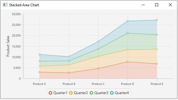 在 JavaFX 中,您可以透過例項化 **javafx.scene.chart.StackedAreaChart** 類來建立堆疊區域圖。
