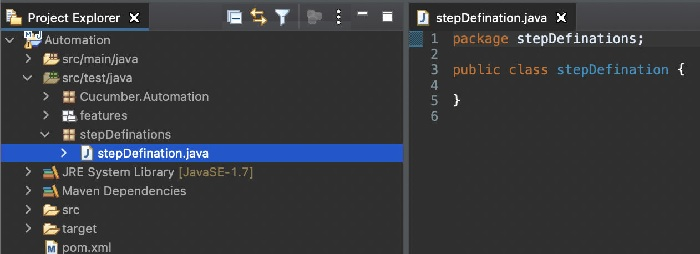 步驟7 - 在src/test/java資料夾內建立一個名為stepDefinations的新包。