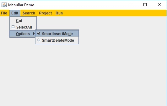 UIManager.put("MenuBar.background", Color.ORANGE);要為選單建立子選單,以下是示例 -