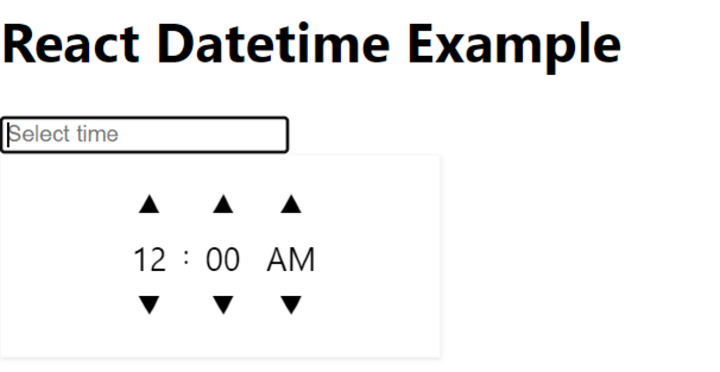 import React, { useState } from 'react'; import Datetime from 'react-datetime'; import 'react-datetime/css/react-datetime.css'; function TimePickerComponent() { const [time, setTime] = useState(''); const handleTimeChange = (momentObj) => { setTime(momentObj.format('HH:mm')); }; return ( <div> <h1>React Datetime Example</h1> <Datetime onChange={handleTimeChange} value={time} dateFormat={false} inputProps={{ placeholder: 'Select time' }} /> </div> ); } export default TimePickerComponent;
