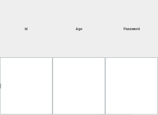 package my; import java.awt.GridLayout; import javax.swing.JFrame; import javax.swing.JLabel; import javax.swing.JPasswordField; import javax.swing.JTextField; import javax.swing.SwingConstants; public class SwingDemo { public static void main(String[] args) throws Exception { JFrame frame = new JFrame("Register!"); JLabel label1, label2, label3; frame.setLayout(new GridLayout(2, 2)); label1 = new JLabel("Id", SwingConstants.CENTER); label2 = new JLabel("Age", SwingConstants.CENTER); label3 = new JLabel("Password", SwingConstants.CENTER); JTextField emailId = new JTextField(20); JTextField age = new JTextField(20); JPasswordField passwd = new JPasswordField(); passwd.setEchoChar('*'); frame.add(label1); frame.add(label2); frame.add(label3); frame.add(emailId); frame.add(age); frame.add(passwd); frame.setUndecorated(true); frame.setSize(550, 400); frame.setVisible(true); } }