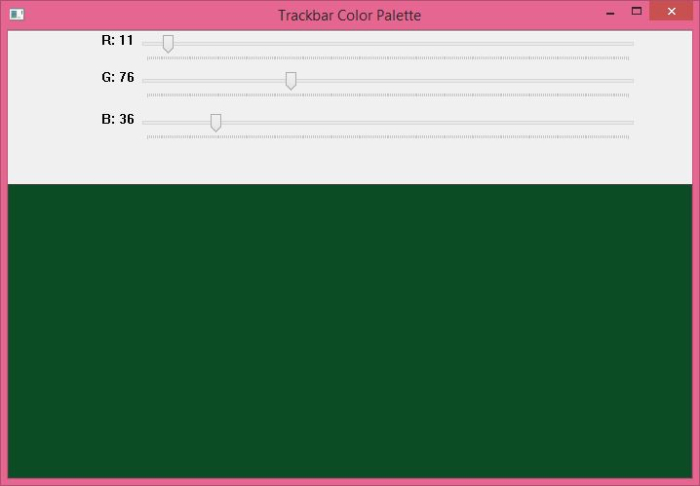 # import required libraries import cv2 import numpy as np def nothing(x): pass # Create a black image, and the window img = np.zeros((300,650,3), np.uint8) window_name = 'Trackbar Color Palette' cv2.namedWindow(window_name, cv2.WINDOW_AUTOSIZE) # create trackbars for color change cv2.createTrackbar('R',window_name,0,255,nothing) cv2.createTrackbar('G',window_name,0,255,nothing) cv2.createTrackbar('B',window_name,0,255,nothing) while(True): cv2.imshow(window_name,img) k = cv2.waitKey(1) & 0xFF if k == ord('q'): break # get current positions of four trackbars r = cv2.getTrackbarPos('R',window_name) g = cv2.getTrackbarPos('G',window_name) b = cv2.getTrackbarPos('B',window_name) img[:] = [b,g,r] cv2.destroyAllWindows()