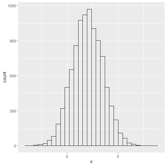 set.seed(987) x<-rnorm(10000,2,1.5) df<-data.frame(x)