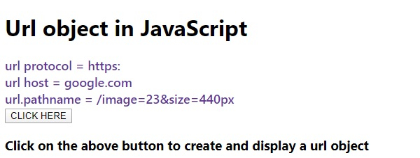 <!DOCTYPE html> <html lang="en"> <head> <meta charset="UTF-8" /> <meta name="viewport" content="width=device-width, initial-scale=1.0" /> <title>Document</title> <style> body { font-family: "Segoe UI", Tahoma, Geneva, Verdana, sans-serif; } .result { font-size: 18px; font-weight: 500; color: rebeccapurple; } </style> </head> <body> <h1>Url object in JavaScript</h1> <div class="result"></div> <button class="Btn">CLICK HERE</button> <h3>Click on the above button to create and display a url object</h3> <script> let resEle = document.querySelector(".result"); let url = new URL("https://google.com/image=23&size=440px"); document.querySelector(".Btn").addEventListener("click", () => { resEle.innerHTML += "url protocol = " + url.protocol + "<br>"; resEle.innerHTML += "url host = " + url.host + "<br>"; resEle.innerHTML += "url.pathname = " + url.pathname + "<br>"; }); </script> </body> </html>