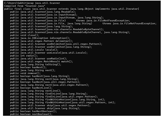 在這裡,我們使用 javap 命令反彙編 java.util 包中的 Scanner 類。下圖顯示了上述程式碼的輸出。它顯示了類修飾符、公共方法以及有關相同方法的詳細資訊。一個先決條件是在命令提示符下使 javap 工具工作需要安裝 JDK。