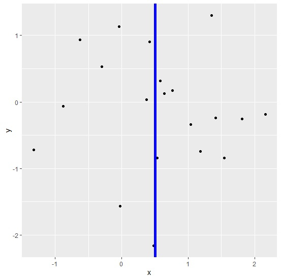 library(ggplot2) ggplot(df,aes(x,y))+geom_point()+geom_vline(xintercept=0.5,lwd=2,colour="blue")
