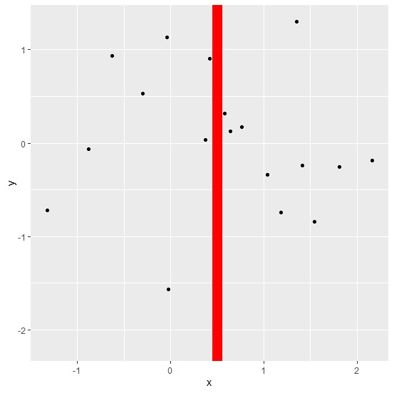 ggplot(df,aes(x,y))+geom_point()+geom_vline(xintercept=0.5,lwd=5,colour="red")