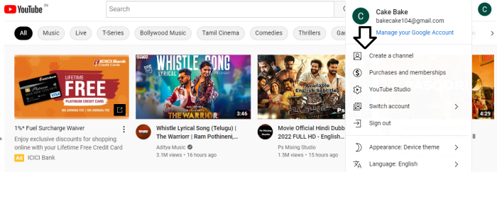 使用您為 YouTube 目的專門建立的專用企業電子郵件 ID 登入 Gmail,然後轉到 YouTube 首頁。在右側,您會發現您已自動登入到您的 YouTube 帳戶(如影像所示)。