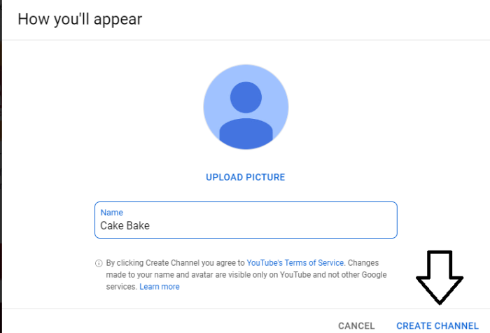點選**建立頻道**後,YouTube 會詢問您頻道名稱和照片。輸入您的企業或品牌的名稱,並上傳您的企業影像或徽標。完成後,點選**建立頻道**。