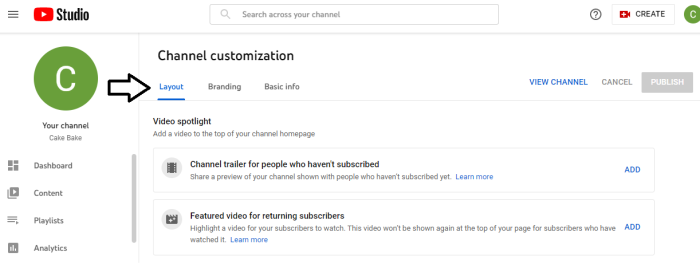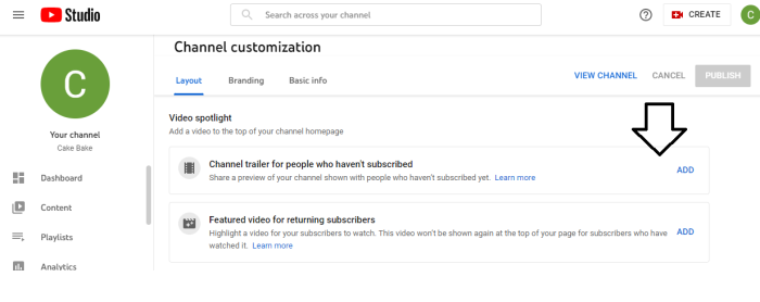 在“佈局”部分中,找到**影片重點**類別,您可以在其中新增 1 分鐘或 30 秒的頻道預告片影片,向尚未訂閱的人解釋您的頻道的用途。