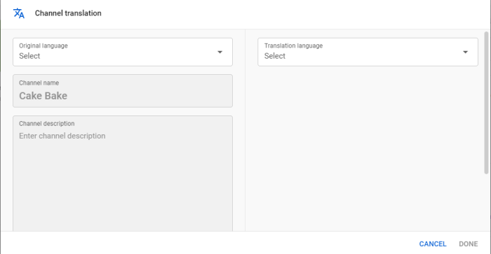 點選**新增語言**後,將顯示此頁面。您可以從下拉選單中選擇原始語言和翻譯語言(如果需要)。