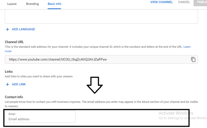 在這裡,您可以新增您的電子郵件地址,以便人們可以就業務諮詢與您聯絡。此電子郵件地址將顯示在您頻道的關於部分,並對您的觀眾可見。