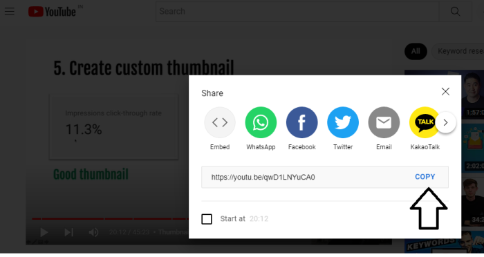 - 複製新的 URL(例如:https://www.youtube.com/watch?v=qwD1LNYuCA0&t=20m10s)並將其貼上到您的瀏覽器或任何需要的地方,它將從您設定的特定時間開始播放。