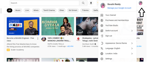 - 步驟 1 − 訪問 Youtube.com 網站並登入你的 YouTube 帳戶。點選你頻道上的個人資料圖示。會出現一個下拉選單(如影像所示)。