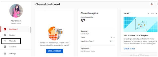 - 步驟 3 − 點選 YouTube 工作室後,你將被重定向到此頁面(如下所示)。在左側選單中,你會找到播放列表選項。點選播放列表按鈕。