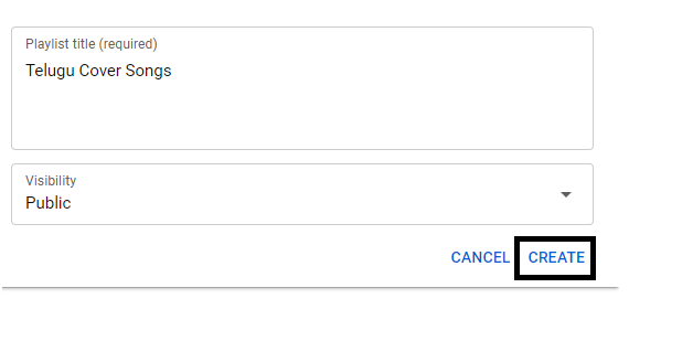 - 步驟 6 − 在彈出的視窗中,我將播放列表標題新增為泰盧固語翻唱歌曲,並將可見性選擇為公開(取決於個人),然後點選建立按鈕。