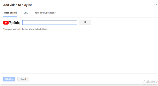 - 步驟 4 − 點選新增影片按鈕後,會彈出一個標題為 – 將影片新增到播放列表的單獨視窗。這裡你可以找到三個子類別 – 影片搜尋、URL、你的 YouTube 影片。不僅可以新增你自己的影片,你還可以將任何你喜歡的 YouTube 影片新增到播放列表中。