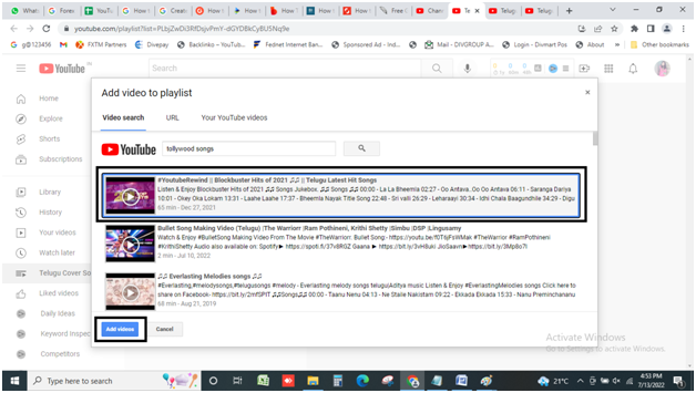 - 步驟 5 − 例如,如果我搜索 Tollywood 歌曲,一堆泰盧固語歌曲將出現在搜尋結果中。選擇你喜歡的任何一首歌曲,然後點選新增影片(如下所示)。